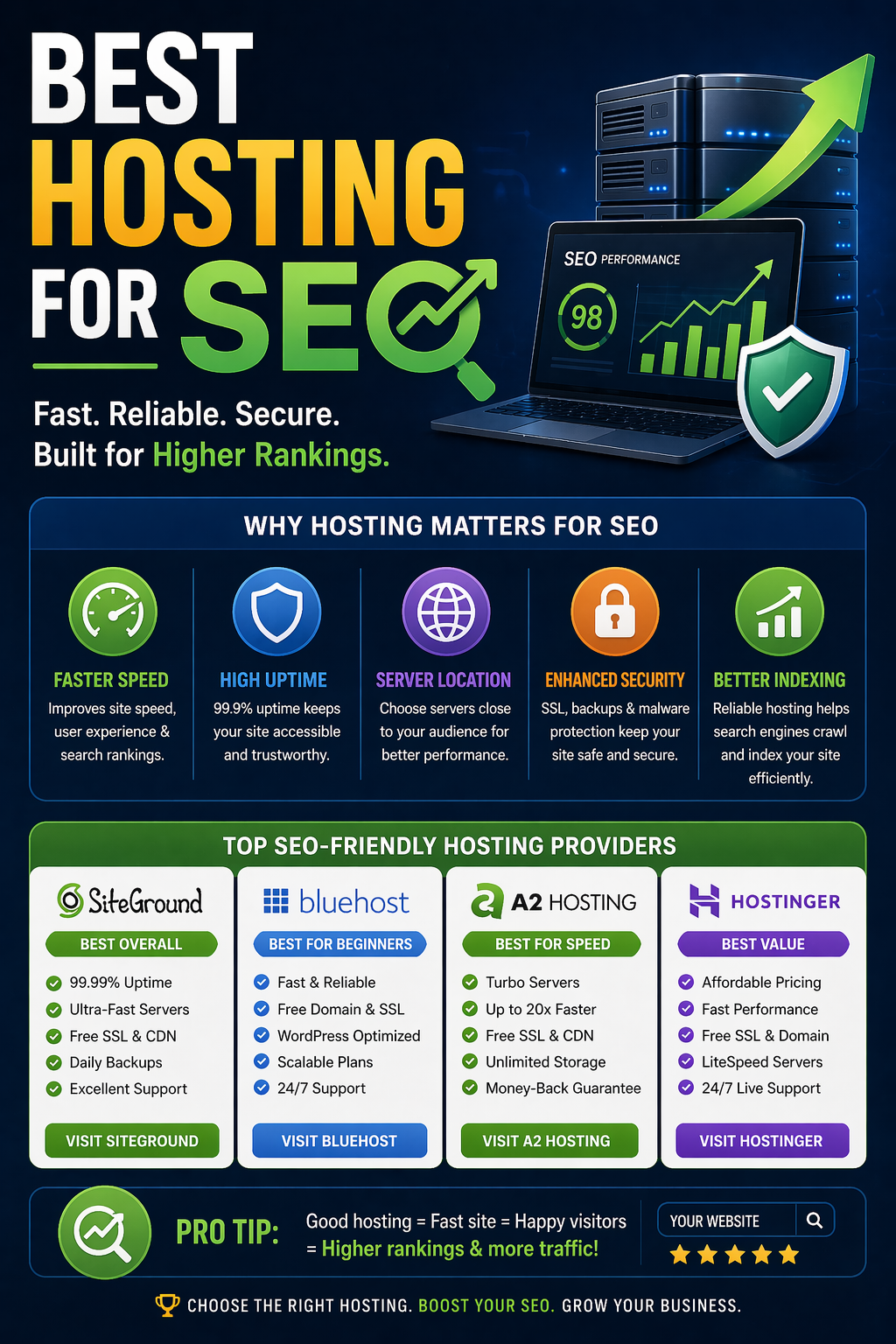The best hosting for SEO is the one that delivers fast, consistent performance as your site grows. Budget options can work early on, but scalability and reliability become more important over time.