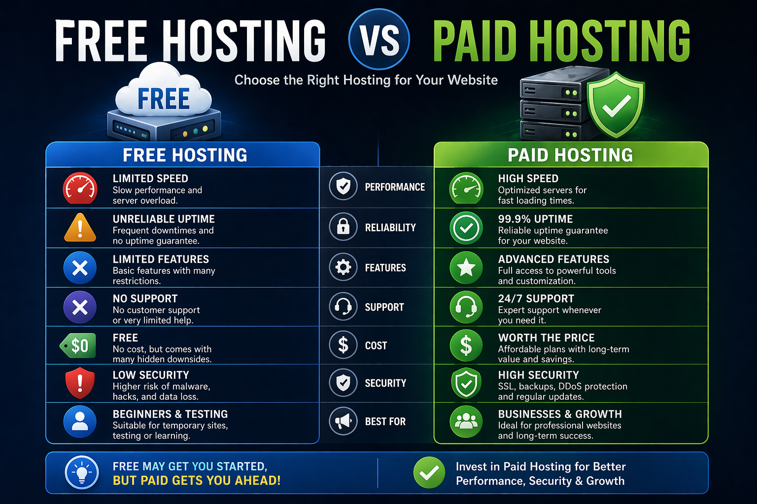 Free hosting is a useful starting point, but it comes with clear limitations. Paid hosting removes those constraints and provides a more stable foundation for growth.